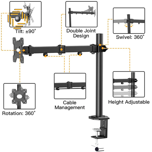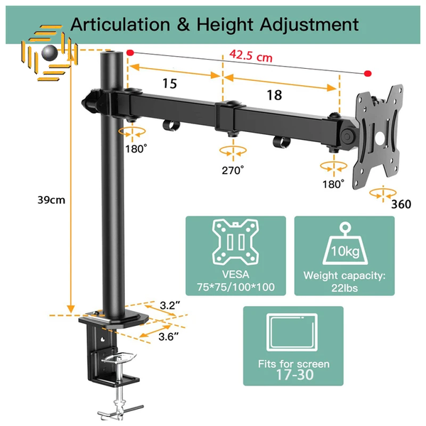 -وزن قابل تحمل: ۱۰ کیلوگرم -متریال: steel tube -میزان چرخش صفحه نمایش: ۸۵° up and ۱۵° down -گردش حول محور عمودی صفحه (چپ و راست): ± ۹۰° -گردش حول محور پایه: ± ۱۸۰° -ماکزیمم طول بازو: ۴۵۲mm -ارتفاع: ۲۰۰-۴۱۰mm -اندازه صفحه جانمایی پیچ: ۱۰x۱۰ و ۷.۵x۷.۵ -سایز نمایشگرهای قابل نصب: ۳۰-۱۷ -وزن محصول: ۳ کیلوگرم -قابل تنظیم و ارگونومیک: قابلیت تنظیم ارتفاع، جهت و زاویهی مانیتور در موقعیتهای متفاوت بسته به نیاز کاربر -مقاوم، محکم و مطمئن: ساخته شده از آلیاژ آلومینیم هواپیمایی - پایداری و تعادل بالا به واسطهی استفاده از مفاصل و ستون مستحکم بهینهسازی و مرتبسازی فضای کار: :مدیریت کابلهای مانیتور با استفاده از فضای تعبیه شده داخل هولدر -ایجاد فضای اضافی بر روی میزکار کاربری آسان و مناسب: نصب آسان به میز - قابلیت حمل و استفاده در محیطهای مختلف