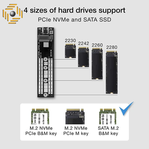 - سازگاری با انواع سایزها: این باکس از سایزهای مختلف SSD M.2 (از جمله 2230, 2242, 2260, 2280) پشتیبانی میکند.